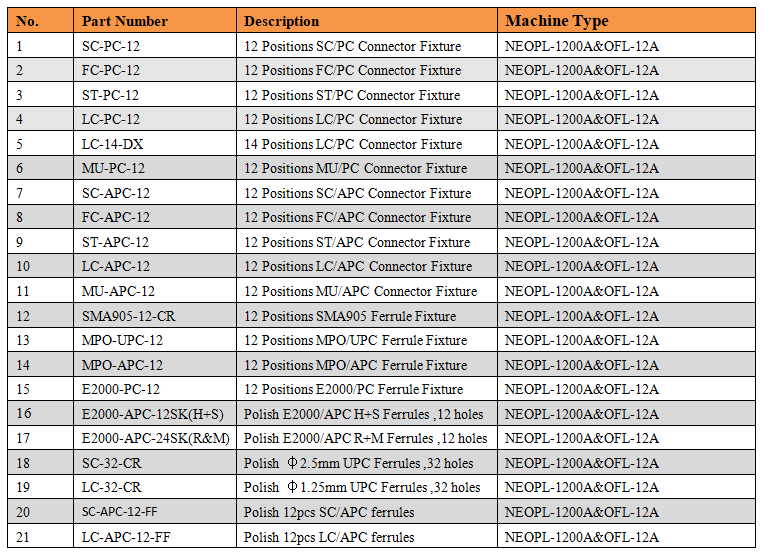 Polishing Fixtures List for NEOPL-1200A & Seikoh Giken OFL-12A