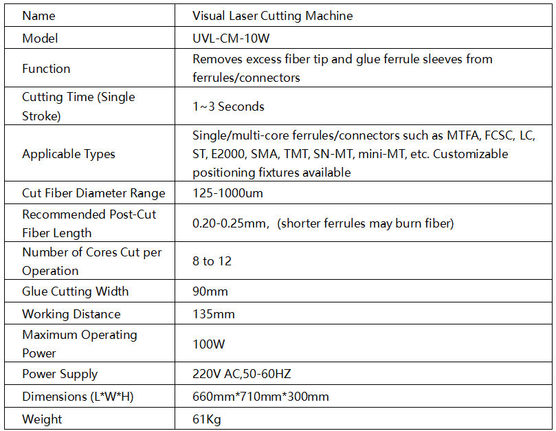 The UVL-CM-10W visual laser cutting machine is a device designed for the optical communications field to laser-cut and remove glue ferrules and excess fiber from single-core and multi-core fiber optic connectors/ferrules, focusing on products like single-core, MT, and FA connectors. It precisely removes glue ferrules and fiber tip, minimizing fiber notches and crescent defects while reducing fiber damage. This streamlines polishing processes and reduces polishing volume, saving time and improving test yield rates. Featuring high precision and ease of operation, it delivers smooth, burr-free fiber end-faces post-cutting—ready for direct polishing with enhanced results. This boosts efficiency significantly.